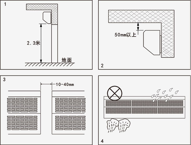 1請將風(fēng)幕機(jī)安裝在室內(nèi)門的上方,風(fēng)幕機(jī)出風(fēng)口離地面的距離應(yīng)高于2 . 3米。